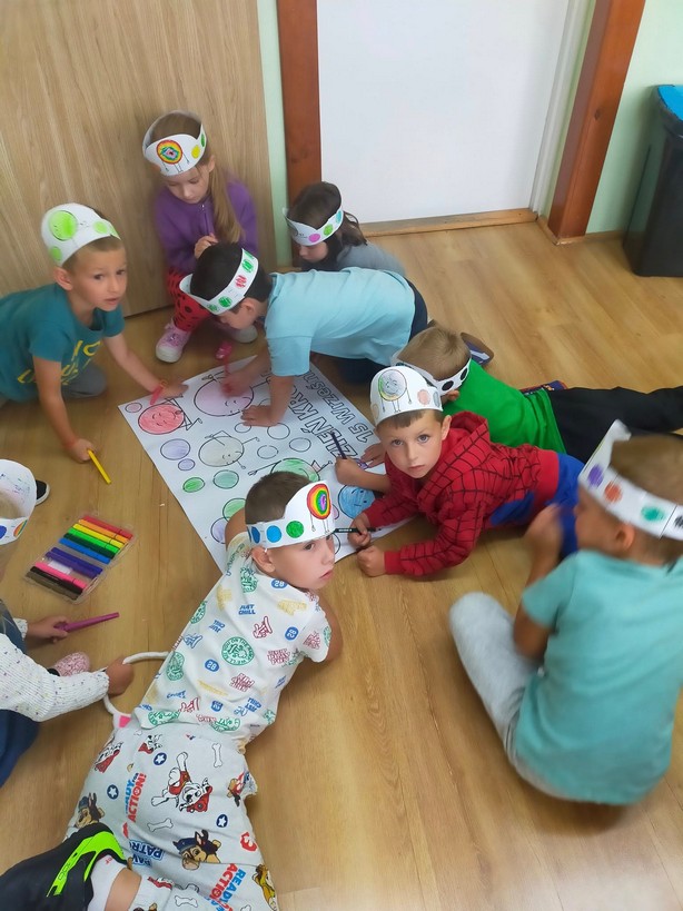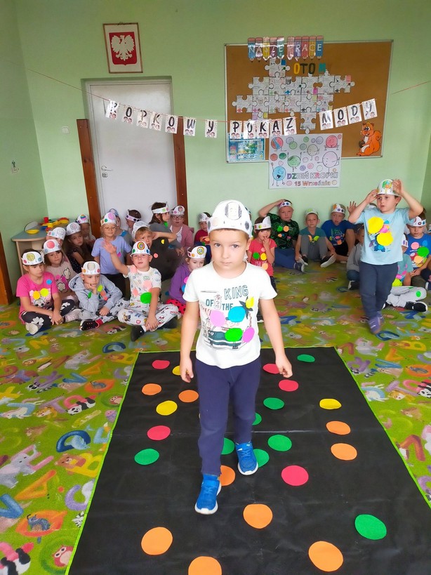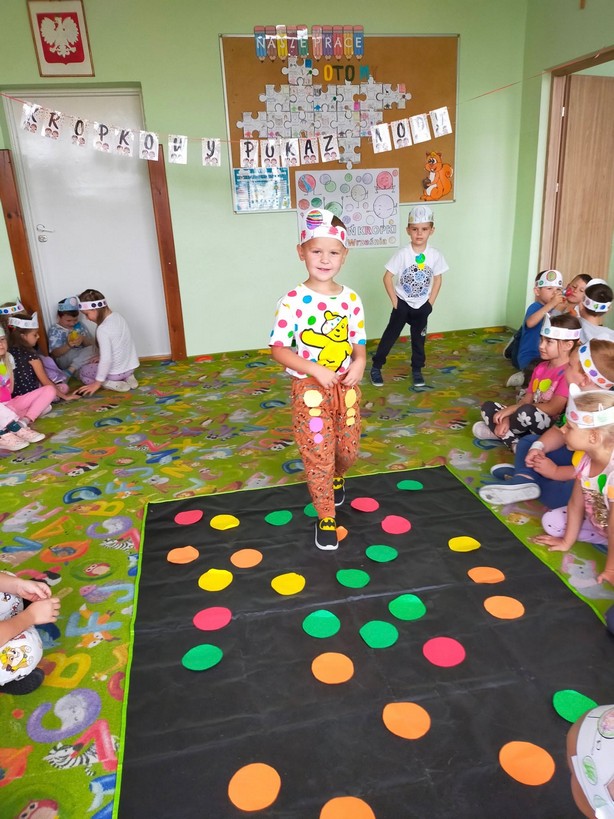 W naszych salach królowały kolorowe kropki – małe i duże, papierowe i malowane, ruchome i przestrzenne. Dzieci z dumą prezentowały swoje „kropkowe” dzieła, ucząc się, że każdy pomysł jest wartościowy, a odwaga w działaniu pozwala odkrywać niezwykłe możliwości.