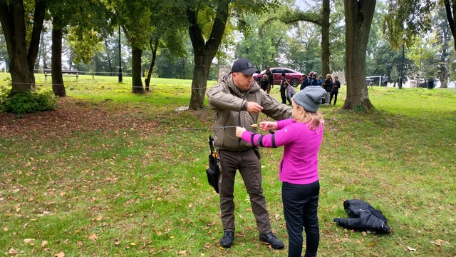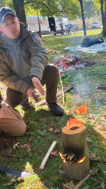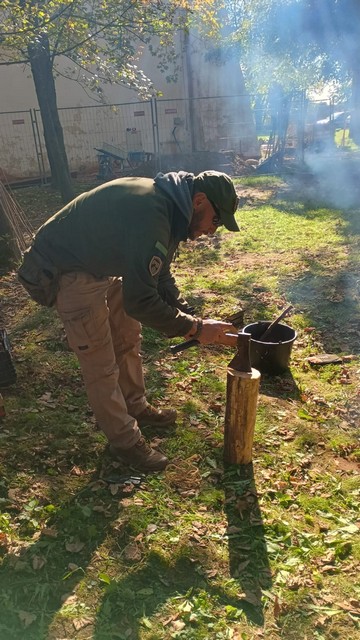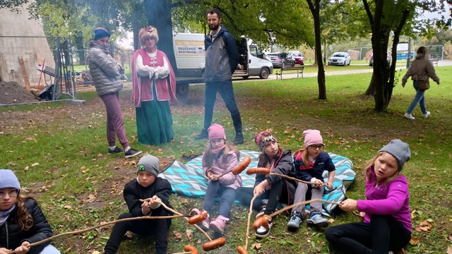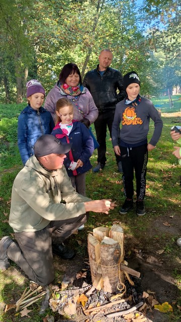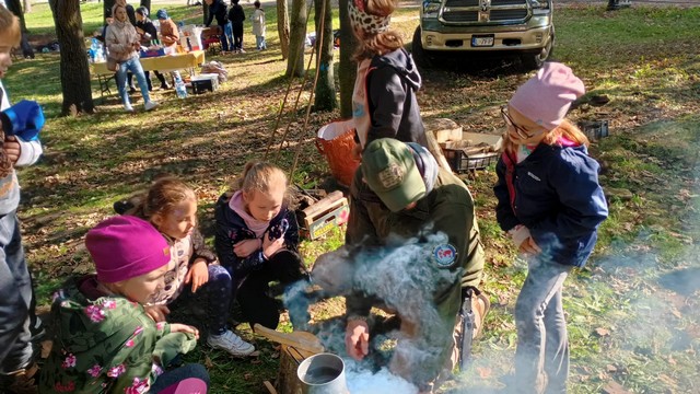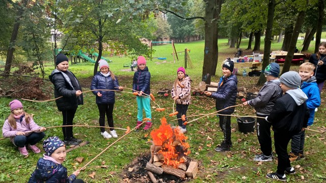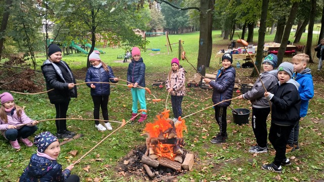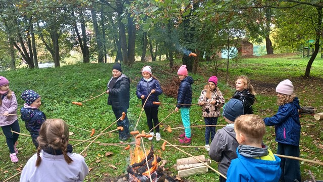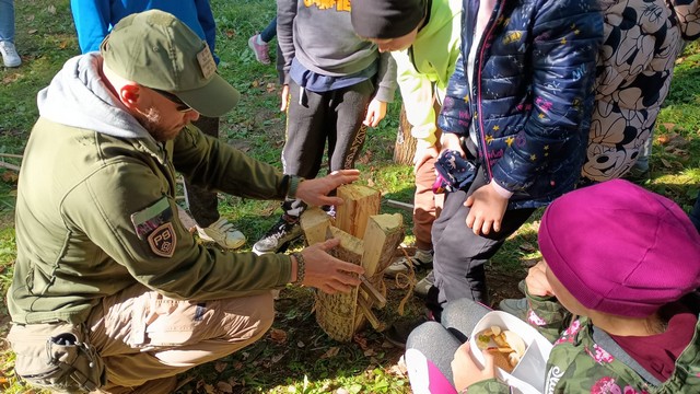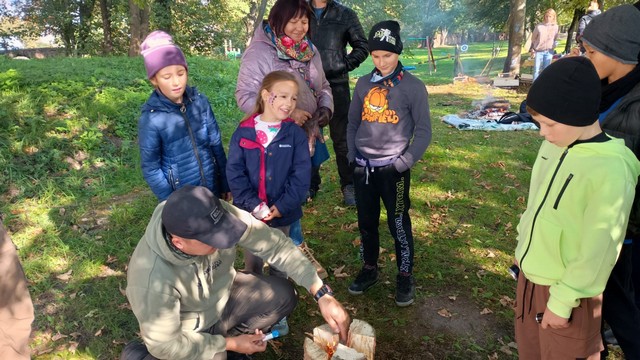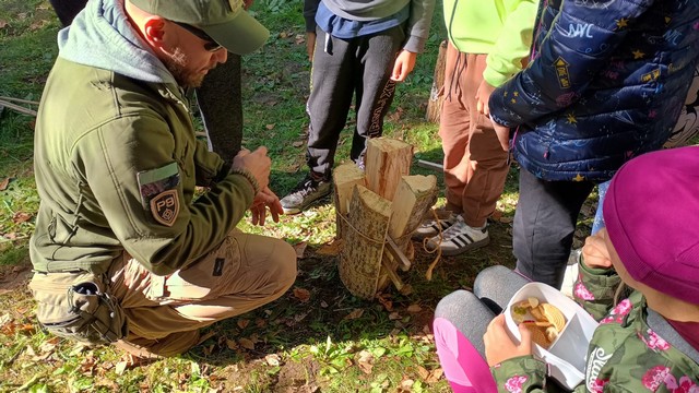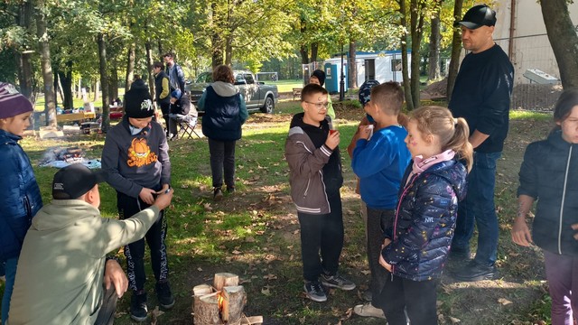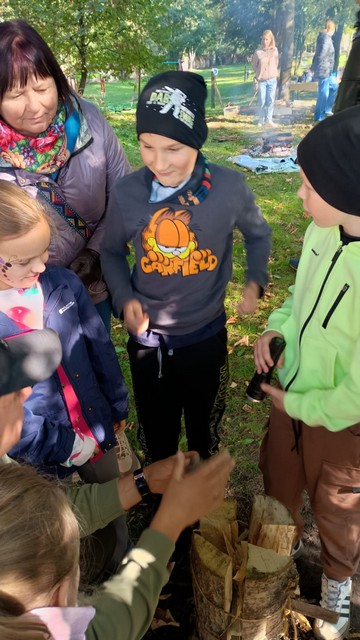 Na początek – ognisko! Ale nie takie zwyczajne. To ognisko zostało rozpalone bez użycia zapałek czy zapalniczek – prawdziwy survival! Dzieci poznały tajniki rozpalania ognia za pomocą krzesiwa, kory brzozy, a nawet… stali i baterii! Harry Potter mógłby się uczyć! Dowiedziały się również, czym jest piec szwedzki – czyli jak ugotować wodę w pieńku drzewa. Teraz już nikt nie zginie w lesie z pragnienia! Potem przyszedł czas na ucztę nad ogniem – pieczenie kiełbasek. Nie obyło się bez śmiechu – zwłaszcza gdy komuś zsunęła się kiełbaska prosto do ognia. Na szczęście nikt nie został bez porcji! A gdy brzuszki były już pełne, przyszła pora na warsztaty z łucznictwa i strzelectwa.
