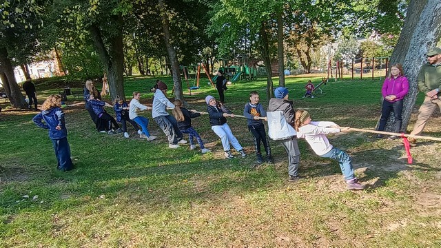 Na wielki finał odbyło się przeciąganie liny, które dostarczyło mnóstwa radości i pozytywnej energii. Kto wygrał? Wszyscy – bo zabawa była przednia! Zmęczeni, ale szczęśliwi, uczniowie wrócili do domu – pełni wrażeń, nowych umiejętności i opowieści, którymi będą mogli chwalić się przez długie tygodnie. Serdeczne podziękowania kierujemy do Rodziców, którzy pomogli w organizacji tego wspaniałego dnia, przygotowali poczęstunek, atrakcje i wsparli nas dobrym humorem, cierpliwością i energią.